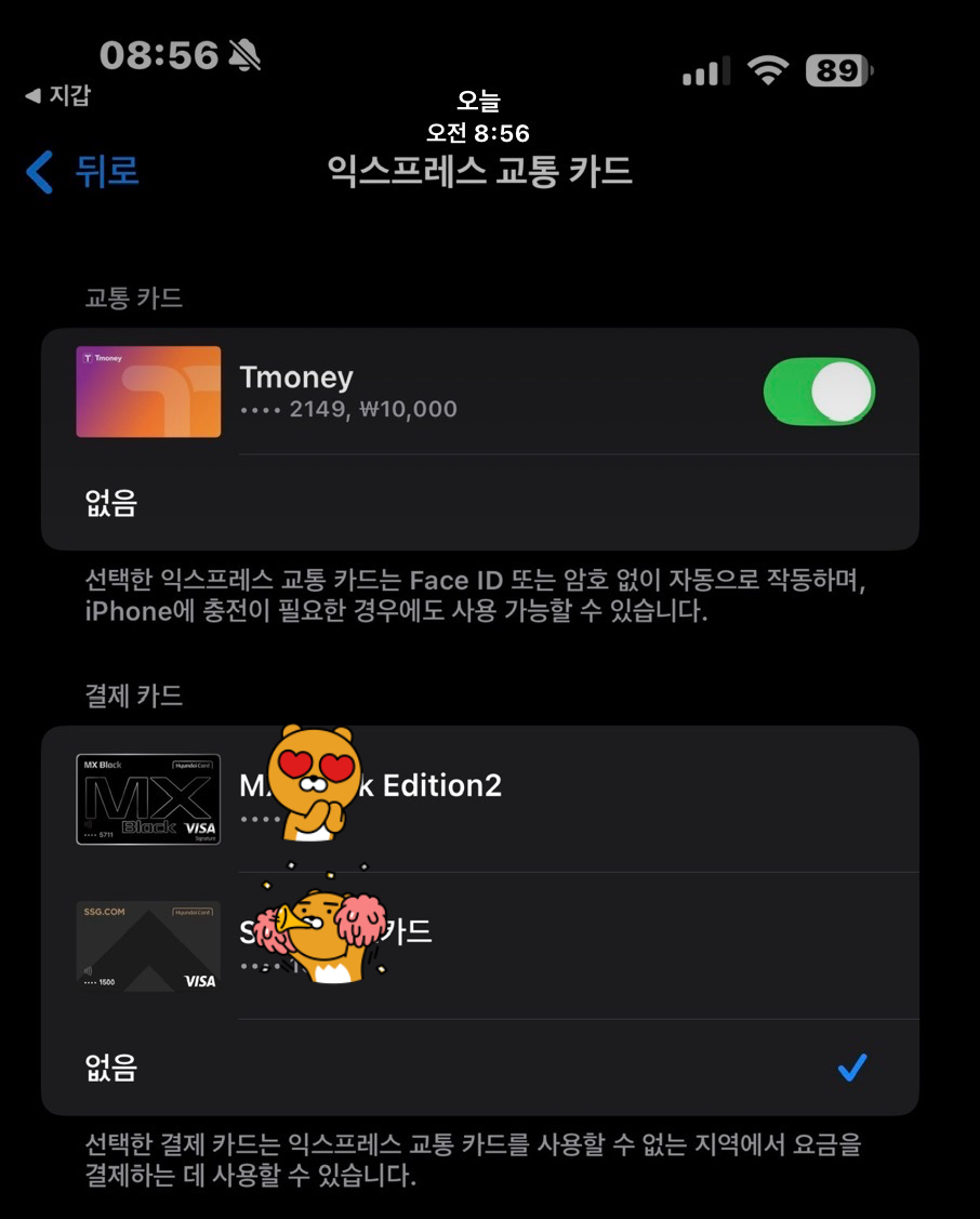 우선, 애플페이로 티머니를 연결하고 (지갑앱-> 상단 오른쪽에 '+'버튼 -> 맨아래 '교통 카드' 버튼 -> 상단에 대한민국 'Tmoney' 선택)